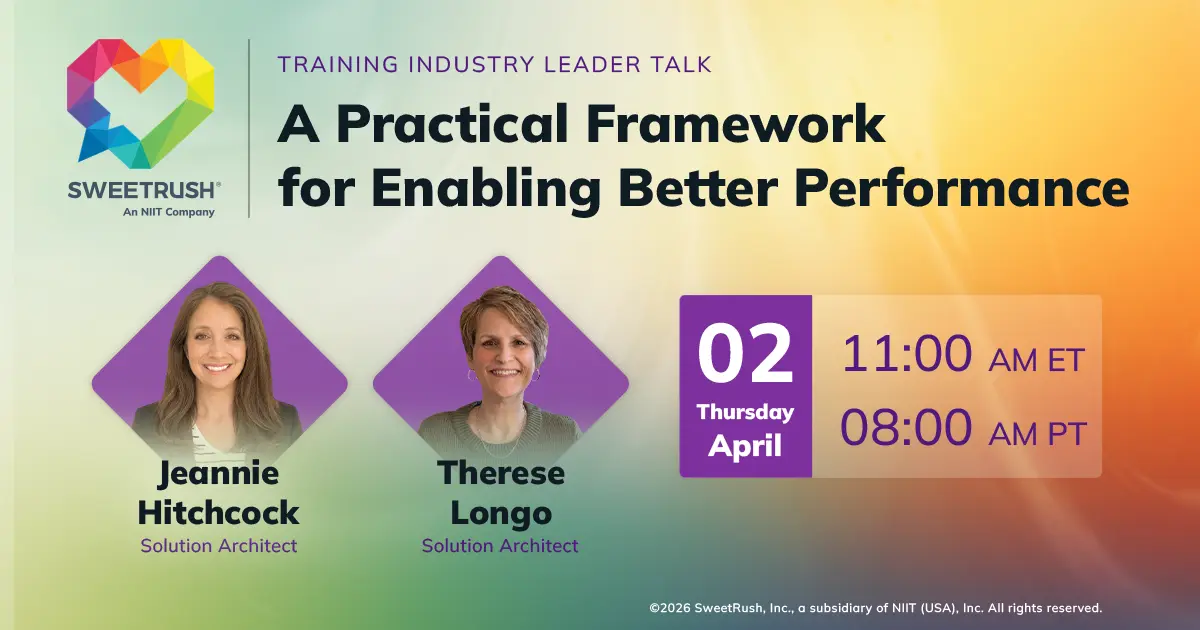 We are thrilled to invite you to our upcoming session at the Training Industry Leader Talk, where SweetRush Solution Architects Jeannie Hitchcock and Therese Longo will help L&D and HR leaders to learn and explore how organizations can move beyond evaluating performance toward enabling it. Participants will learn how clear expectations, practice-based learning and performance support work together to drive meaningful results. We will also examine how new tools, including artificial intelligence (AI), can extend guidance, feedback and coaching in the flow of work.